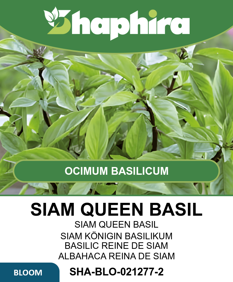 Siam Queen basil thrives in sunny locations with well-drained, moist soil. Regular watering is essential to keep the soil consistently damp but not waterlogged. Prune the plant frequently to encourage bushier growth and prevent flowering, which helps maintain flavorful leaves. This compact variety is ideal for containers on balconies or terraces, reaching about 30 cm tall. Harvest fresh leaves from mid-summer to early autumn for the best spicy aroma and taste. Protect the plant from strong winds and cold temperatures to ensure healthy development throughout the growing season.