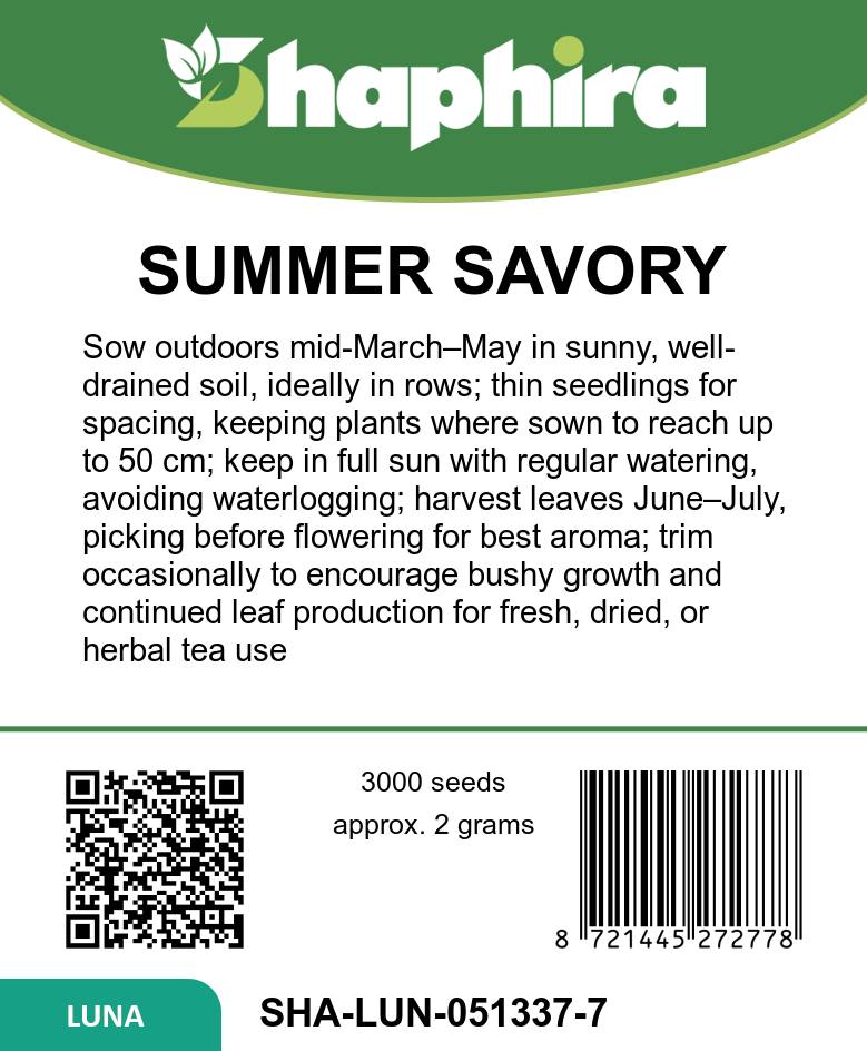 These satureja hortensis seeds are valued for their rich aroma, especially popular as summer savory for bean dishes and other everyday recipes. Harvest from June to July to enjoy leaves at their peak, whether used straight from the garden or dried for later use. As classic Mediterranean herb seeds, they pair well with vegetables, grilled dishes and homemade herb blends. With their upright, bushy habit and love of sunshine, they are excellent sunny herb garden seeds, equally suitable as summer savory seeds for pots on a balcony or terrace. This reliable line of annual savory seeds offers an easy way to enhance your herb collection with a distinctive, aromatic accent.