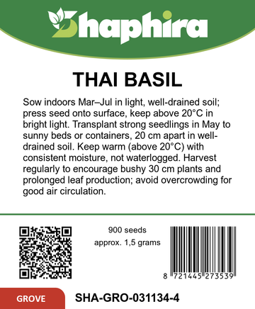 These Thai basil seeds for cooking are perfect for sowing indoors from March through July, with harvest time spanning July to September. Growing this culinary basil variety indoors or in your garden allows you to enjoy fresh, vibrant leaves year-round. The compact height of the plant, reaching about 30 cm, suits small spaces and container gardening. Whether cultivating Thai basil seeds for garden use or indoor herb gardening, this sweet anise basil variety enhances both the aesthetic and aroma of your space while providing a fresh, peppery basil leaf harvest to elevate your cooking.