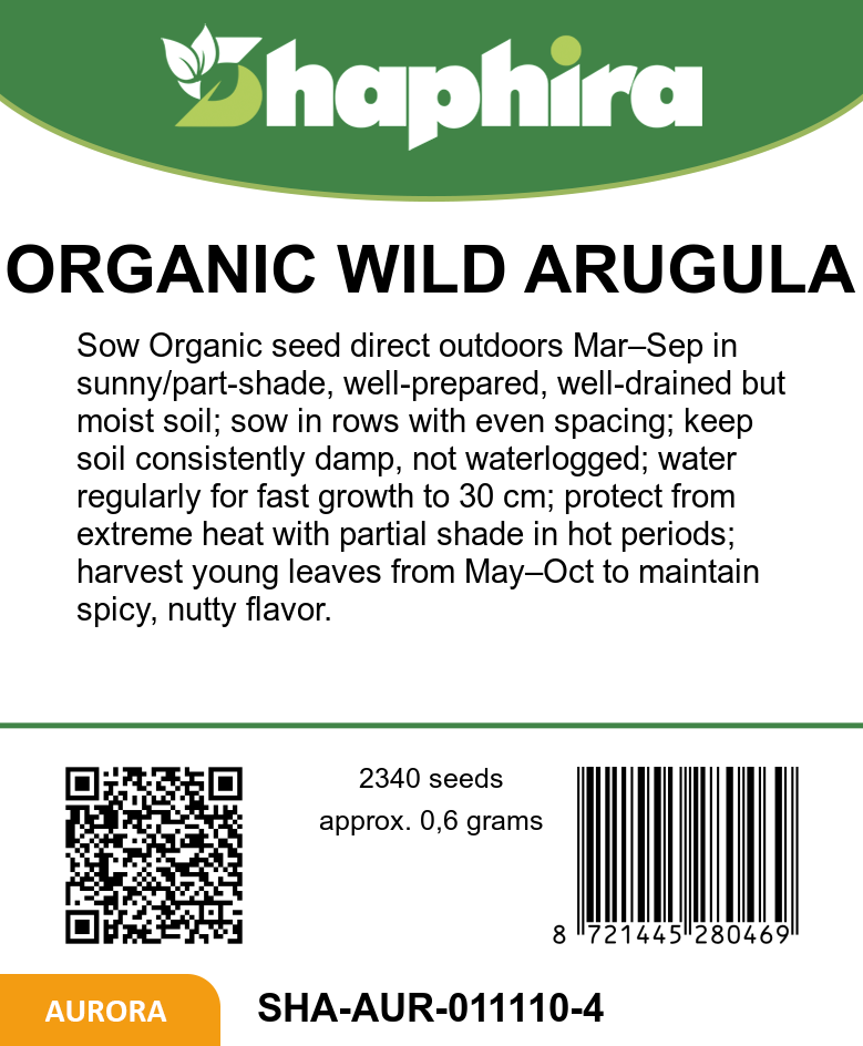 Discover the vibrant taste of organic wild arugula seeds (Diplotaxis tenuifolia), known for their fast-growing habit and distinctive spicy flavor. These wild rocket seeds produce nutty flavored greens perfect for enhancing salads, carpaccio, and dishes featuring young cheese. Their robust, peppery notes make them a popular choice among spicy salad greens enthusiasts seeking a fresh, lively addition to outdoor vegetable gardens. With a typical height of 30 cm, this variety thrives in outdoor cultivation from spring through autumn, making it ideal for spring and summer sowing seeds.
