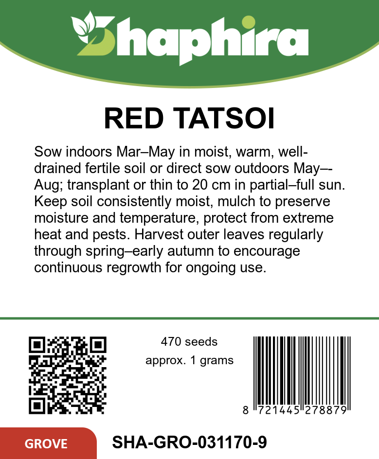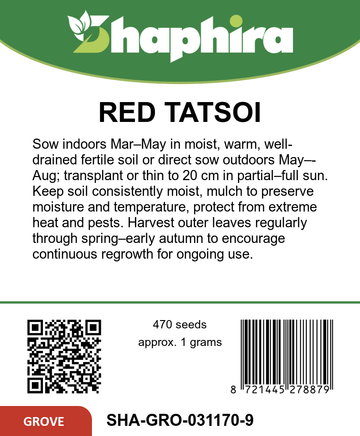 Sow Japanese Tatsoi seeds indoors from March to May and outdoors from May to August for best results. Transplant seedlings after they emerge to ensure strong growth. These vibrant red leaves flourish in well-drained soil with consistent moisture and partial to full sunlight. Harvest leaves continuously from spring through early autumn to enjoy their spicy, garlicky mustard flavor at peak freshness. This quick-growing variety thrives in garden beds or containers, making it a versatile addition to stir-fries, salads, and Asian dishes. Regular harvesting encourages new growth and keeps plants productive throughout the season.