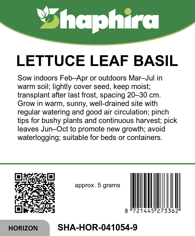 Sow Lettuce Leaf Basil seeds indoors from February to April or outdoors from March to July when soil temperatures are warm. Lightly cover seeds with a thin layer of soil and keep the soil moist until germination. Space seedlings about 20-30 cm apart to allow room for large leaf growth. Transplant indoor seedlings outdoors after the last frost to ensure healthy development. Consistent warmth encourages vigorous growth, making this basil ideal for fresh culinary use throughout the warmer months.
