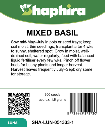 Sow mixed basil seeds from mid-May to July in seed trays or directly in pots, thinning seedlings for healthy growth. Choose a sunny yet sheltered spot to encourage vibrant leaves reaching about 40 cm tall. Harvest leaves from July to September for fresh use or dry them in a well-ventilated area, then store in an airtight container to preserve aroma and flavor. This colorful basil mix, including lemon, cinnamon, Dark Opal, and sweet varieties, adds both visual charm and diverse taste to your herb garden, perfect for culinary creations throughout the season.