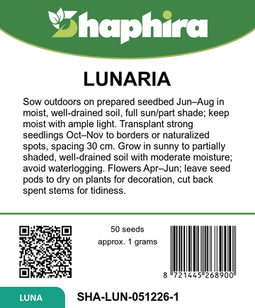 Sow Lunaria seeds in a seedbed from June to August and transplant seedlings in October or November for best results. Choose a sunny or partially shaded spot with well-drained soil to encourage healthy growth. This biennial plant thrives in garden borders, walls, or naturalized areas, reaching up to 90 cm tall. Enjoy vibrant violet blooms from April to June, followed by distinctive, coin-like seed pods perfect for dried floral arrangements. Regular watering during dry spells supports robust flowering, while minimal maintenance ensures lasting garden charm and decorative seed capsules for creative bouquets.