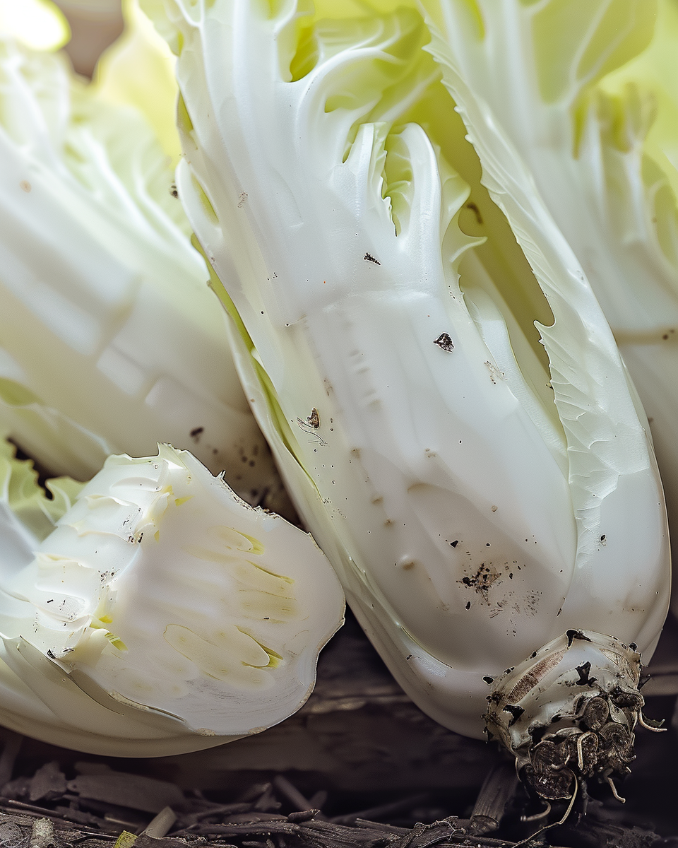 In autumn, dig up the roots and trim the leaves about 2 cm above the crown. Then place the roots upright in a 25 cm deep pit covered with soil and straw to provide darkness essential for developing tight, flavorful heads.