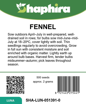Sow fennel seeds outdoors from April to July in well-drained soil with full sun exposure for best results. Maintain soil temperatures around 18-20ΒΊC, and cover the bulb area with soil to encourage thick, crunchy bulb development. Thin seedlings regularly to allow space for robust growth up to 100 cm tall. Harvest bulbs and tender leaves from July through October, enjoying their sweet, anise-like flavor raw or cooked. Regular watering and avoiding waterlogged conditions help prevent root issues, while harvesting before the first frost ensures optimal taste and texture.