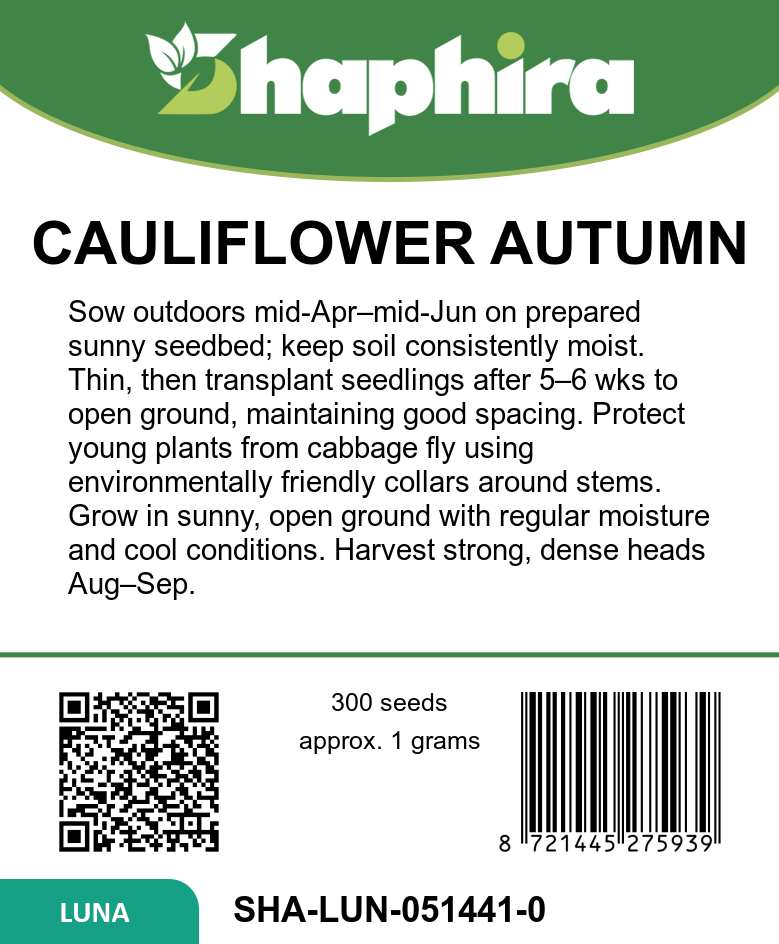 Sow cauliflower seeds outdoors from mid-April to mid-June on a prepared seedbed in a sunny location. Thin seedlings and transplant them after 5 to 6 weeks to ensure healthy spacing. To protect young plants from cabbage fly, place environmentally friendly collars around the stems. Keep the soil consistently moist for optimal seedbed conditions. This variety thrives in open ground and is well-suited for autumn cultivation, allowing harvesting from August through September. Following these steps will help establish strong plants ready for a bountiful late-season harvest.