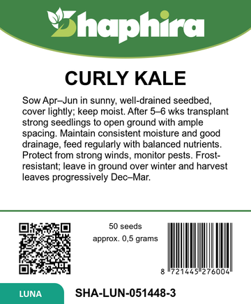The Curly Kale Reflex F1 from Brassica oleracea is a frost-resistant kale variety ideal for extended outdoor cultivation. This bush kale variety features finely curled, very dark green leaves that stand out for their rich color and texture. Perfect for open ground kale planting, these curly kale seeds thrive when started on a seedbed from April through June, ensuring a robust plant ready for a winter kale harvest. Its frost-resistant qualities allow it to remain healthy and vibrant outside well into the colder months, making it a reliable choice for gardeners seeking durable and flavorful kale.