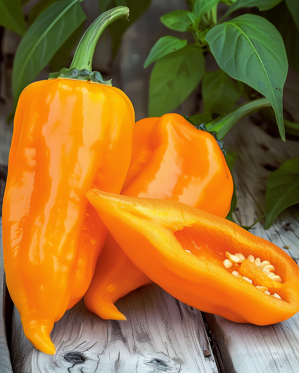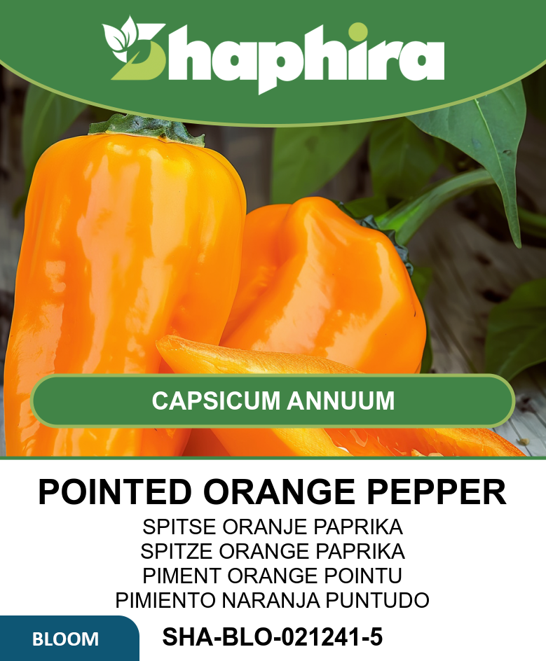 The Timia Orange pointed pepper produces bright orange fruits up to 25 cm long with a sweet, rich flavor. These compact plants yield sweet peppers ideal for stuffing or enjoying fresh as a snack.