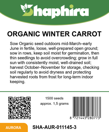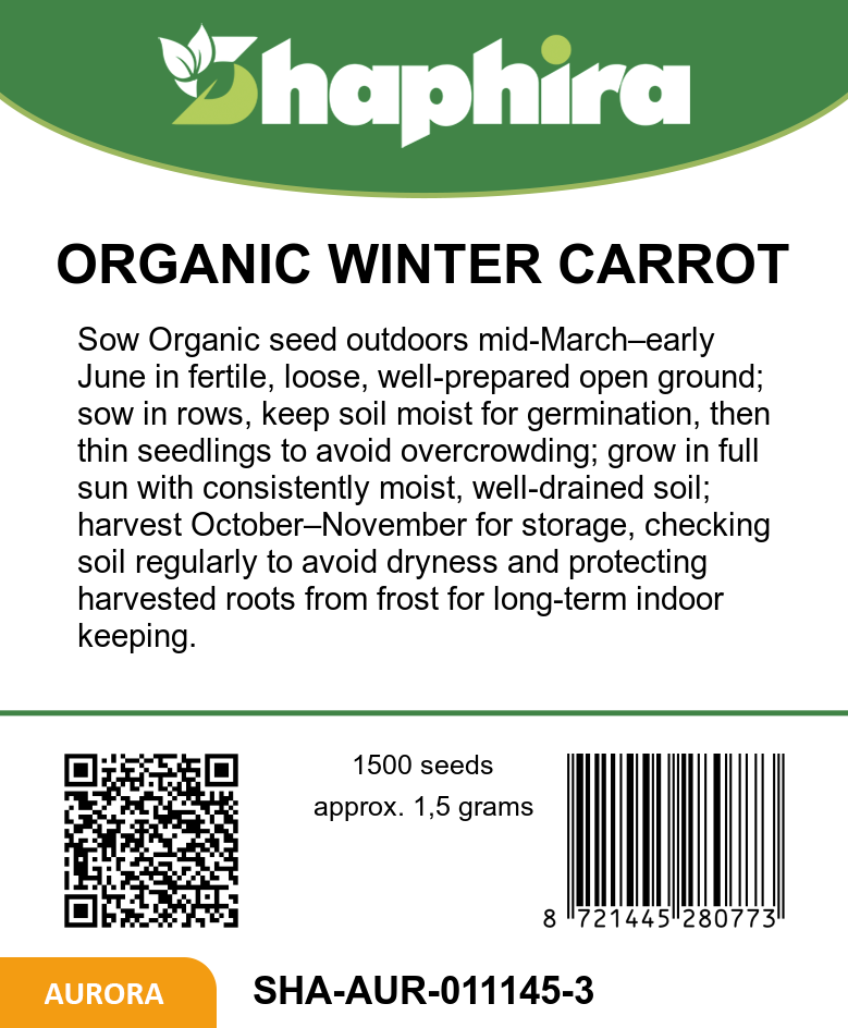 Sow Organic Winter Carrot Seeds Flakkeese 2 from mid-March to early June in well-prepared open ground, spacing rows to allow room for growth. Keep the soil consistently moist for optimal germination and healthy root development. Thin seedlings if needed to avoid overcrowding and encourage large, sweet carrots. Harvest between October and November for the best flavor and storage qualities. These carrots grow up to 40 cm tall and store well indoors, making them an excellent choice for winter enjoyment. Regular care and proper timing ensure a rewarding, productive crop.