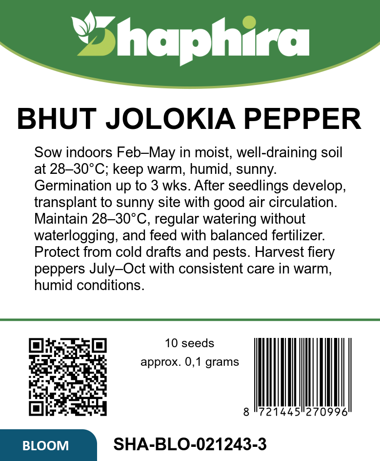 Bhut Jolokia Red peppers thrive in warm, humid environments with plenty of sunlight. Maintain a temperature around 28β30Β°C to encourage strong growth and fruit development. Regular watering is essential, but avoid waterlogging to prevent root issues. Feeding with a balanced fertilizer supports vigorous plants and fiery pepper production. As these plants require patience due to their longer maturation, consistent care will yield intense, flavorful chili fruits. Protect plants from cold drafts and pests to ensure a healthy, bountiful harvest from July to October.