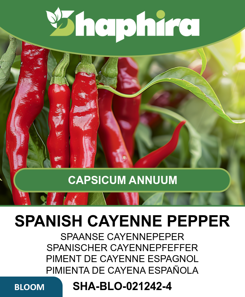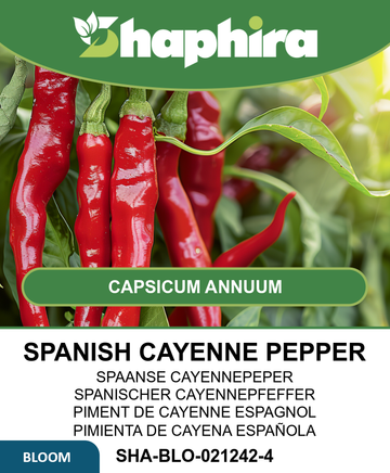 To nurture Spanish Cayenne peppers, maintain consistently moist soil and provide ample sunlight, ideally near a bright windowsill or in a greenhouse. Regularly pinch the main stem to encourage 3 to 4 strong side shoots, removing extra shoots to promote healthy growth. Support plants with stakes to keep the slender fruits upright. These peppers thrive in pots on balconies or terraces, benefiting from warm temperatures and good air circulation. Harvest the fiery red peppers from mid-summer to early autumn, enjoying their vibrant heat in your favorite spicy dishes.