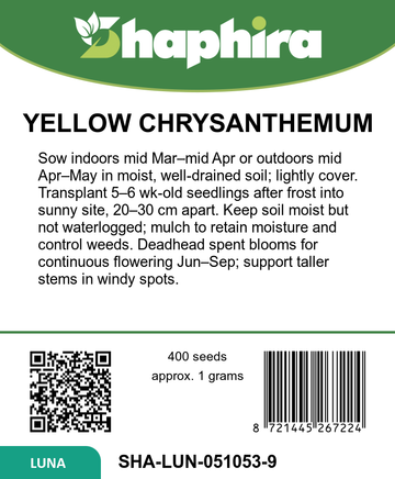 Sow Eldorado Yellow Chrysanthemum seeds indoors from mid-March to mid-April in seed trays or outdoors from mid-April to the end of May in a prepared seedbed. Lightly cover the seeds with soil and keep the substrate moist for optimal germination. Once seedlings reach around 5-6 weeks old and the risk of frost has passed, transplant them into their final growing position with a spacing of approximately 20-30 cm. Choose a sunny spot with well-drained soil to support healthy establishment and naturalizing potential.