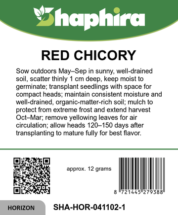 Sow Redloaf Chicory seeds outdoors from May to September for a late-season harvest extending from October to March. This robust variety thrives in cooler temperatures, developing compact, vividly red heads with crisp white ribs. For best results, plant in well-drained soil with ample sunlight and moderate watering to encourage healthy growth. Allow heads to mature fully to enjoy their sweet, mellow flavor that balances the characteristic bitterness. Regular harvesting throughout the winter ensures fresh, colorful leaves for salads, making this chicory an excellent choice for garden enthusiasts seeking vibrant and flavorful winter greens.