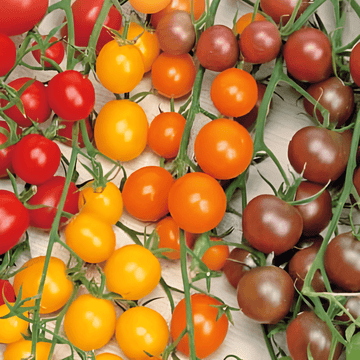 Vibrant mixed cherry tomato seeds in four colors for diverse, flavorful home gardens.