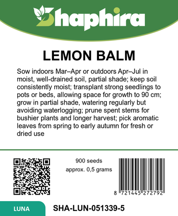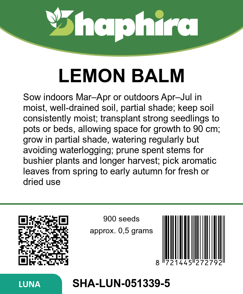 These melissa officinalis seeds are excellent lemon balm seeds for containers, thriving in pots on terraces, balconies or near the kitchen door. As perennial herb seeds, they return year after year under suitable conditions, offering a long-lasting feature in the garden. This lemon scented herb thrives in a partially shaded spot, so they are perfect as lemon balm seeds partial shade for corners that do not receive full sun all day. The aromatic foliage can be harvested from spring through early autumn, with young leaves especially valued in herbal infusions and as a fresh garnish in salads, desserts and savoury recipes. Ideal as culinary herb garden seeds, lemon balm can be combined with other herbs to create a richly scented outdoor space.