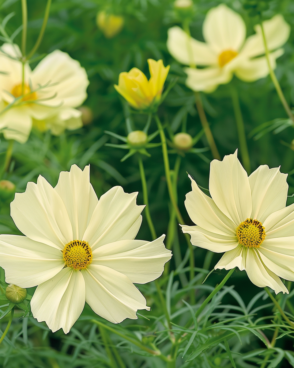 Cosmos Xanthos seeds grow into annual plants that produce soft lemon yellow blooms. These compact plants reach heights of 30-50 cm and are perfect for terraces, balconies, and butterfly gardens due to their delicate flowers and natural appeal.