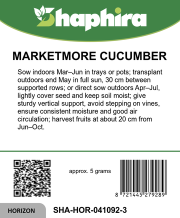 Marketmore cucumber seeds produce straight, dark green cucumbers up to 20 centimeters long. They are disease resistant, especially against powdery mildew, scab, and mosaic virus, making them ideal for outdoor gardening.