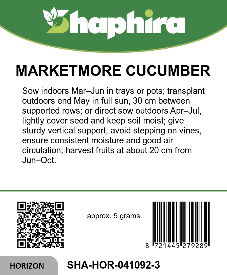 For best results, sow Marketmore cucumber seeds indoors from March to June or directly outdoors from April to July. Support the vines with stakes or trellises to save space and encourage straight fruit growth. Avoid stepping on the plants, as damaged vines can produce bitter cucumbers. This variety thrives in well-drained soil with consistent moisture and benefits from regular harvesting to promote continuous fruiting. Its resistance to powdery mildew, scab, and mosaic virus makes it a reliable choice for an extended harvest from June to October in your garden.