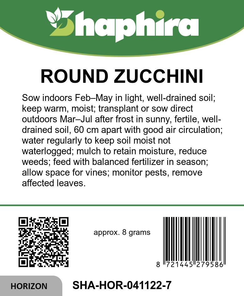 For successful growth, sow round zucchini seeds indoors from late February to May, then transplant outdoors after the last frost between March and July. Choose well-drained, fertile soil with plenty of sunlight to encourage healthy development. Water consistently but avoid waterlogging to maintain tender fruit. Harvest from June to October when fruits reach medium-small size and display their characteristic light green color. Regular picking promotes continuous production. This variety’s mild flavor and delicate skin make it ideal for fresh salads or light cooking, adding a gentle touch to your summer dishes.