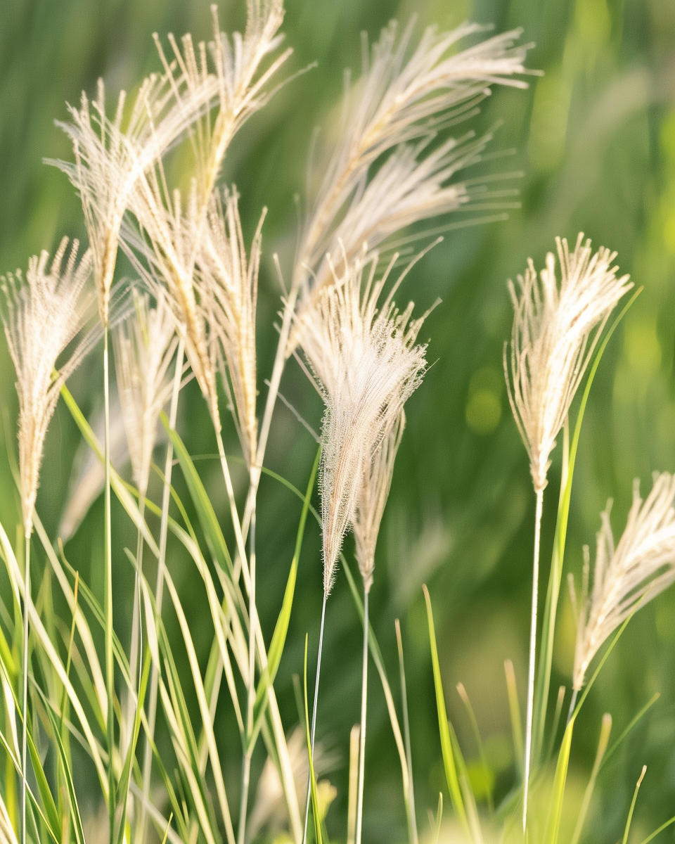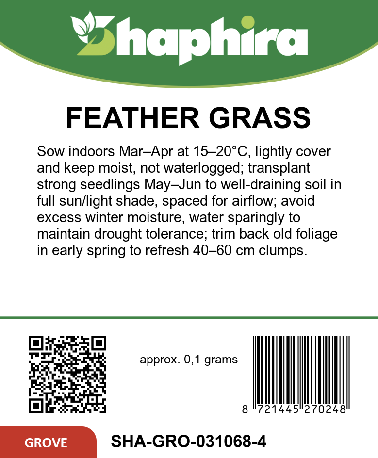 Sow feather grass seeds indoors from late March to April at 15-20Β°C, lightly covering them with soil and maintaining moisture without waterlogging. Once seedlings develop strong roots, transplant them in small groups to larger pots or directly outdoors from May to June. Choose a well-draining site to prevent excess moisture, especially during winter. Feather grass thrives in loose soil and benefits from spacing to allow airflow. Planting in clusters or as solitary specimens enhances their elegant pony tail appearance, ensuring a graceful addition to your garden borders or mass plantings.