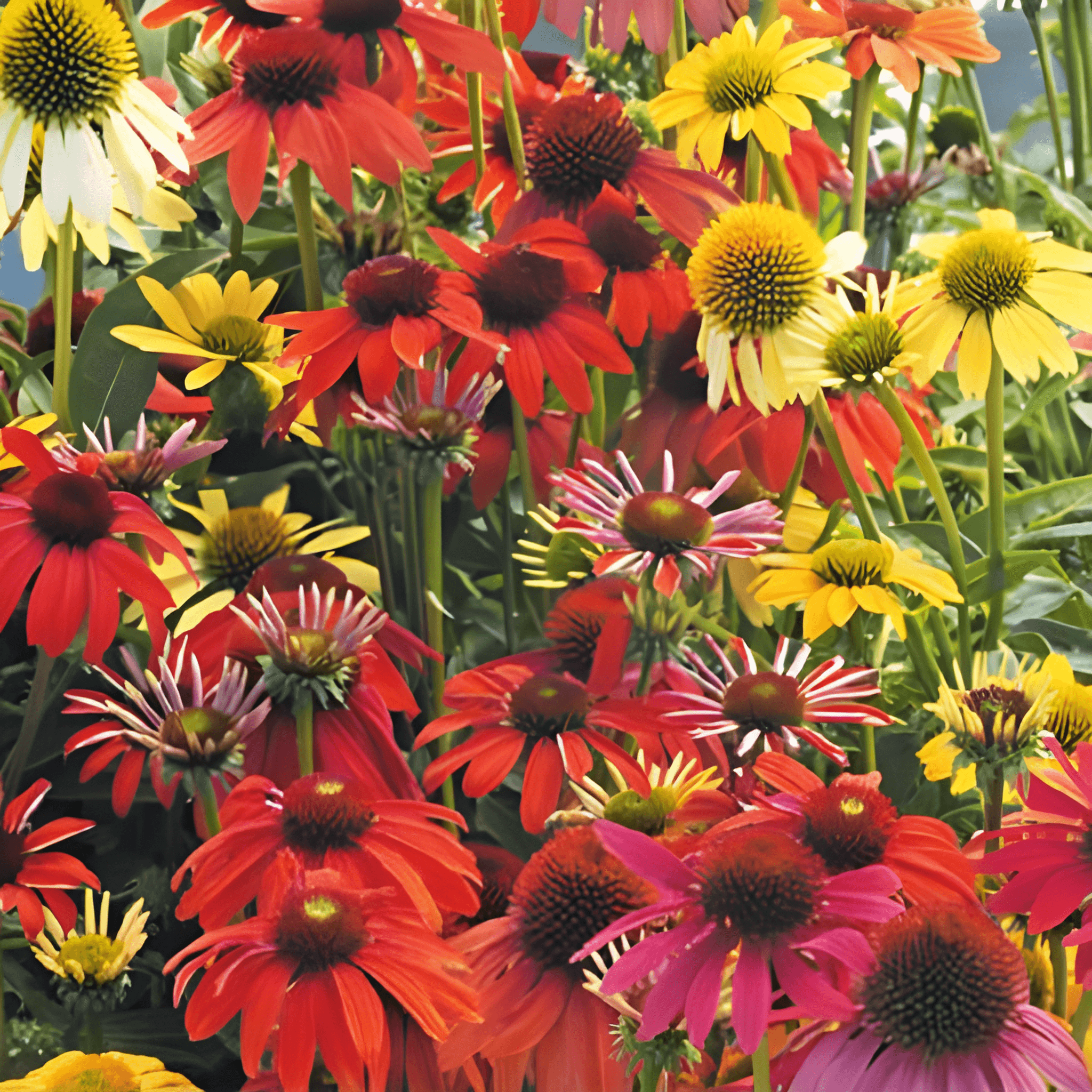 This mix produces vibrant coneflowers in a variety of shades including orange, yellow, red, purple, and cream, creating a colorful display in your garden.
