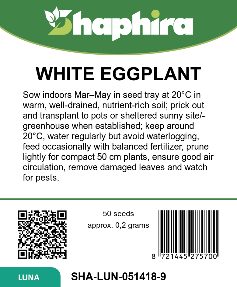 White eggplants flourish in sheltered, sunny locations, thriving both indoors and in greenhouses. Maintain a consistent temperature around 20Β°C for optimal growth, especially in early stages. Regular watering is essential, but avoid waterlogging to prevent root issues. Provide well-draining, nutrient-rich soil and consider occasional feeding with balanced fertilizer to support healthy foliage and vibrant flowers. Prune lightly to encourage air circulation and compact growth. Watch for pests and remove any damaged leaves promptly to keep the plant vigorous. With proper care, this decorative white eggplant will add elegance and charm to your garden or indoor space.