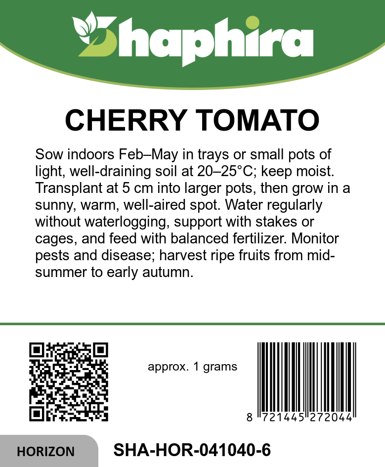 Sow Principe Borghese cherry tomato seeds indoors from February to May in warm, bright conditions. Cover lightly with fine compost and keep evenly moist until germination. When seedlings reach about 5 cm, transplant into individual pots and grow on in a sunny, sheltered spot. Gradually harden off before placing outside in containers, grow bags, or beds. Provide canes or a small support if growth becomes vigorous, and water regularly at the base. Pick the deep red oval fruits frequently to encourage continued production.