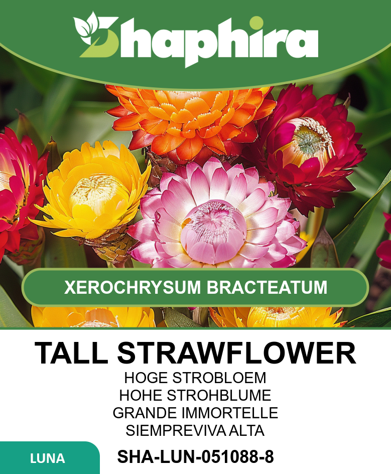 Tall Strawflower plants thrive in full sun and well-drained soil, reaching up to 80 cm tall. Regular watering keeps them vibrant, but avoid waterlogging to prevent root issues. Deadheading spent flowers encourages prolonged blooming from July to September. These bright papery blooms are ideal for cutting before full bloom; hang them upside down in a dark, dry place to preserve their color and shape for stunning dried arrangements. Their resilience and striking appearance make them perfect for adding lasting texture and color to garden borders or floral crafts.