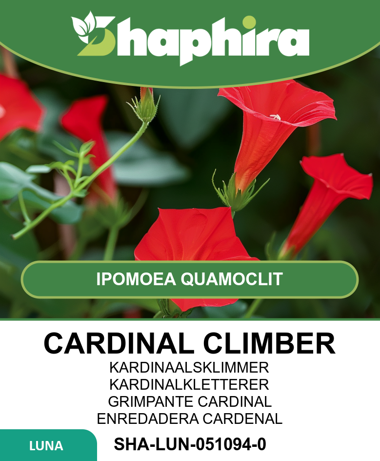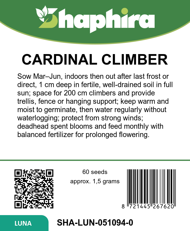 Sow Cardinal Climber vine seeds indoors from March to April or directly outdoors between April and June for best results. Choose a sunny spot with fertile, well-drained soil to encourage vigorous growth up to 200 cm. Support the vine with trellises or fences to showcase its striking red trumpet flowers from June through September. This annual climber thrives with regular watering and benefits from occasional feeding to enhance bloom intensity. Its delicate foliage and vibrant flowers also make it a stunning option for hanging baskets, attracting pollinators and adding lively color to any garden space.