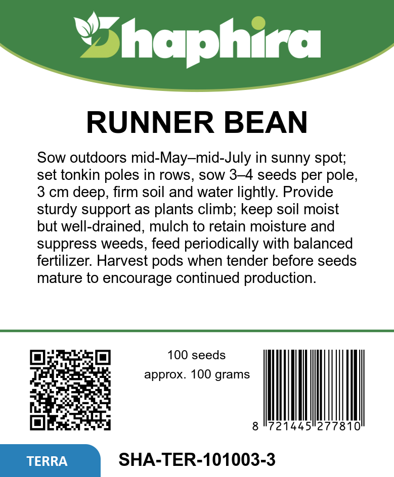 Sow the bronze runner beans directly outdoors from mid-May to mid-July in a sunny spot for best results. Plant seeds about 3 cm deep, placing 3-4 beans per tonkin pole to support their vigorous climbing habit. These striking red-flowering beans thrive when allowed to climb poles or trellises, enhancing both garden aesthetics and harvest yield. Regular watering and well-drained soil will encourage healthy growth. Harvest tender snap beans from August to October for fresh, flavorful additions to your meals, while enjoying the ornamental beauty of their vibrant blossoms throughout the growing season.