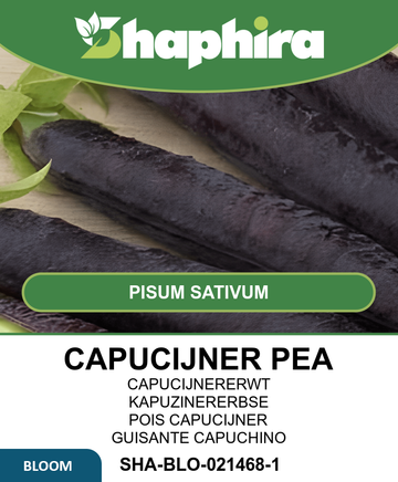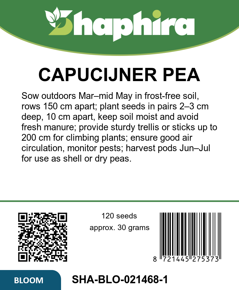 Sow Capucijners Ezetha’s Krombek Blauwschok seeds outdoors from March to May in well-drained soil, placing two seeds every 10 cm in rows spaced 150 cm apart. Provide sturdy support such as trellises or sticks, as plants can reach up to 200 cm tall. Keep the soil moist but avoid fresh manure to ensure healthy growth. This variety offers excellent frost resistance and can be harvested from June to July. Its versatile blue pods are perfect for use as shell peas or dried peas, adding unique color and flavor to your garden harvest.