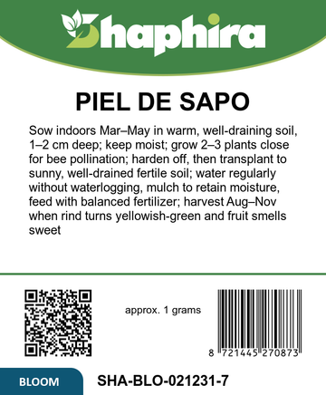 Sow Piel de Sapo melon seeds indoors from March to May in seed trays or pots filled with warm, well-draining soil. To encourage faster germination, soak seeds in lukewarm water for 12 hours before sowing. Plant seeds about 1β2 cm deep and keep the soil consistently moist. For successful pollination, grow at least two to three plants close together, as bees and bumblebees are essential for transferring pollen between male and female flowers. Once seedlings are strong enough, gradually harden them off before transplanting outdoors or into a greenhouse for a fruitful summer to autumn harvest.