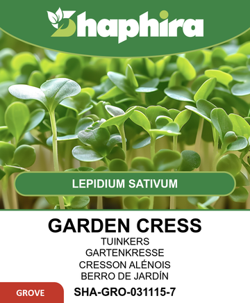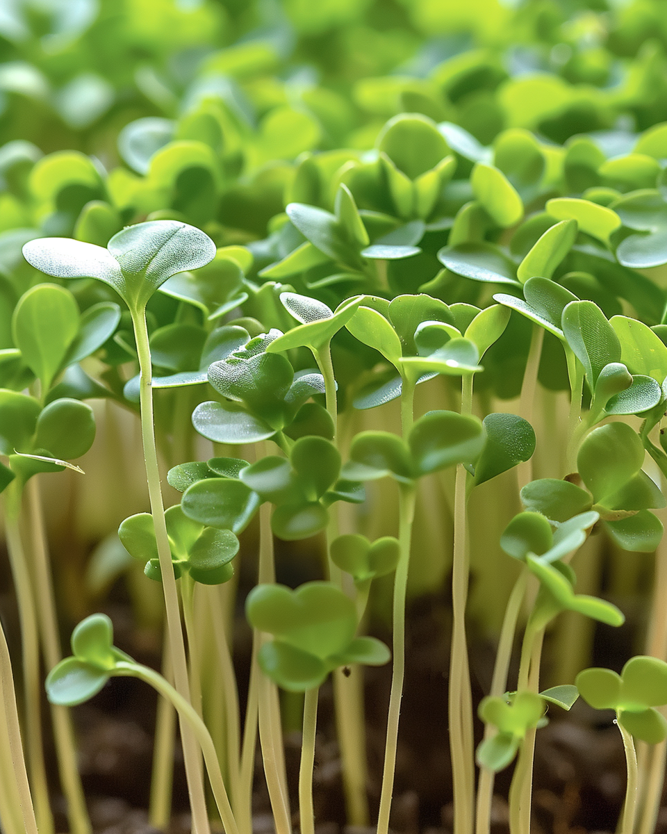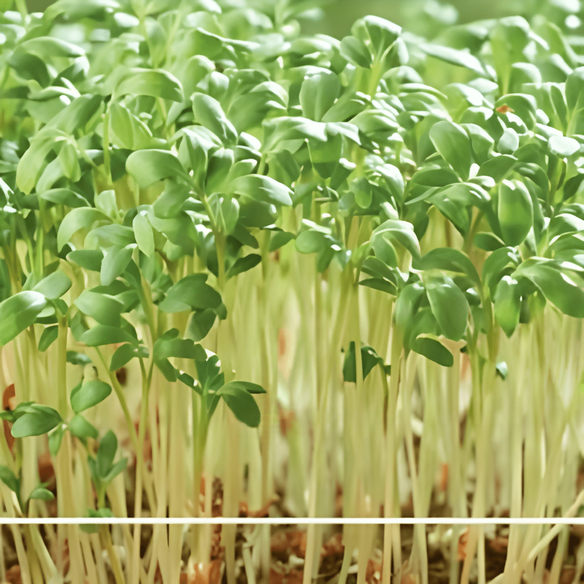 Fast-growing garden cress microgreens with dense, peppery sprouts for salads, sandwiches and garnishes.