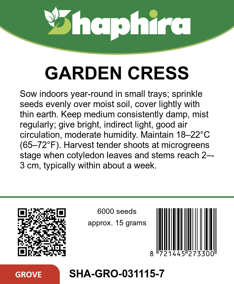 Specially selected as garden cress microgreens seeds, this variety is perfect for continuous indoor production throughout the year, from January to December. These fast growing microgreens form dense, upright micro leaf garden cress with a crisp bite and classic cress character. Use them as a finishing touch on soups, egg dishes, or open sandwiches, or mix them into a colorful microgreen seeds mix on your countertop. With these indoor microgreen seeds you can grow garden cress microgreens in small trays or shallow pots, ensuring a steady supply of fresh greens whenever you need them.