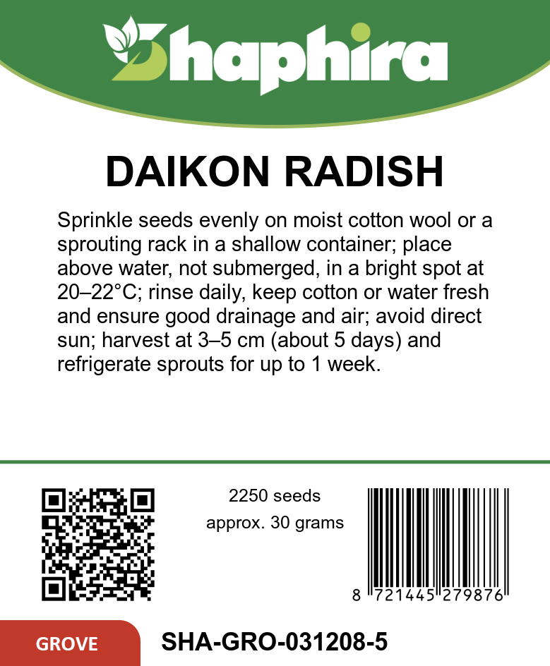 These organic sprouting radish seeds are specially selected for producing uniform, spicy radish sprout seeds indoors throughout the year. As indoor sprouting vegetable seeds, they suit simple sprouting trays, jars or shallow containers, allowing you to enjoy fresh salad sprout seeds in every season. The young organic daikon radish sprouts develop tender shoots that reach around 3β5 cm, just right for garnishing rice bowls, poke-style dishes and open sandwiches. Combine with an organic radish sprouting mix for extra colour, or use this organic daikon sprouting seeds kit idea as a focused choice when you prefer a clear, clean radish flavour in your homegrown sprouts.