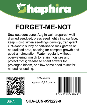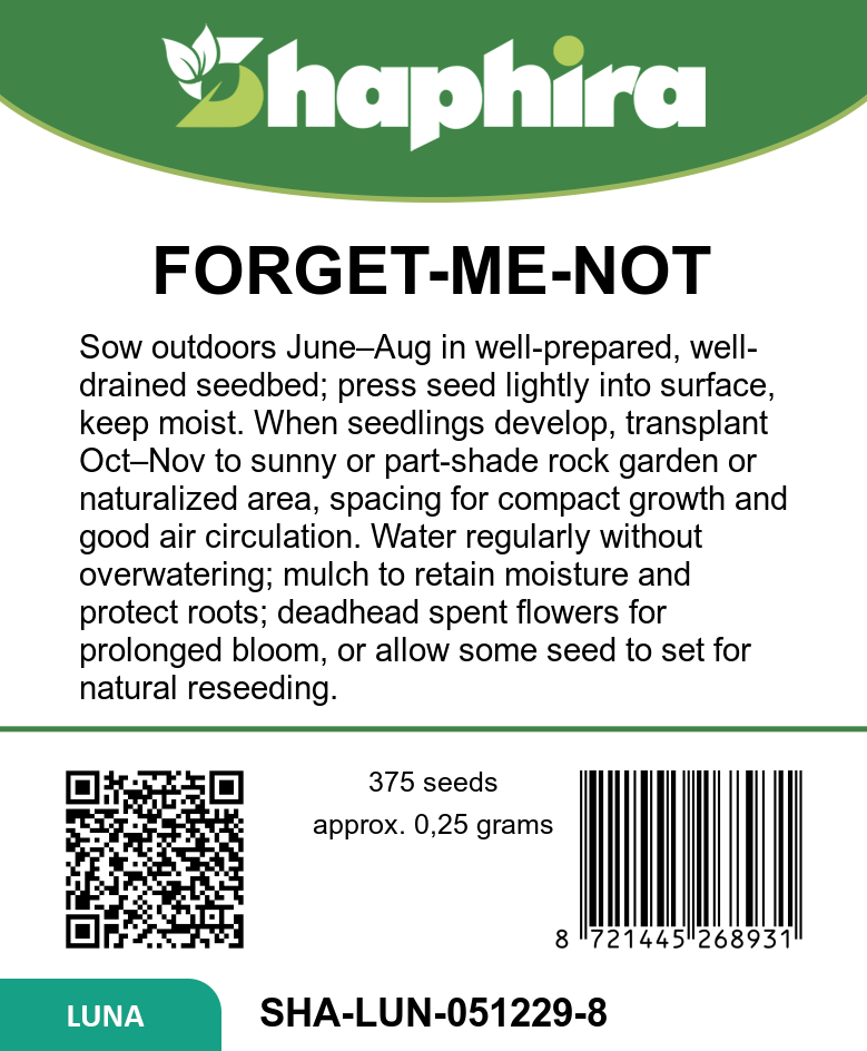 Sow forget-me-not seeds outdoors from June to August in a well-prepared seedbed with well-drained soil. Lightly press the seeds into the soil surface without covering them deeply, as they require light for germination. Keep the seedbed moist during the early stages. Once seedlings develop, transplant them carefully in October or November to their permanent location, ideally in rock gardens or naturalized areas. Space the plants to allow for a compact growth habit, and choose spots with good air circulation to encourage healthy development and early blooming between April and June.