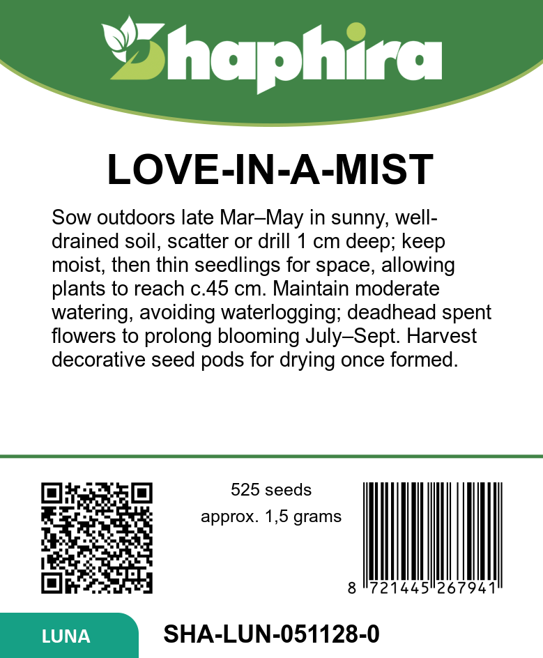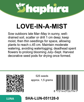 Sow Love-in-a-Mist seeds outdoors from late March to May in well-drained soil with full sun exposure for best results. Scatter seeds thinly or sow in rows, thinning seedlings to about 15 cm apart to encourage healthy growth. These 45 cm tall plants bloom beautifully from July to September, adding soft pastel hues to garden borders. For a lasting touch, harvest flowers for fresh bouquets or collect seed pods once mature to dry for decorative use. Regular watering and avoiding overcrowding will help maintain vibrant, long-lasting blooms throughout the summer season.