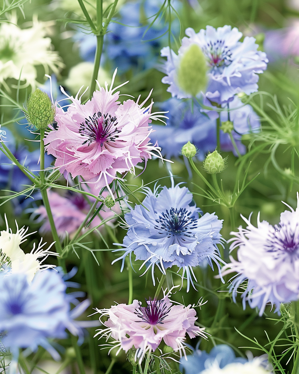 Love-in-a-Mist Persian Jewels thrive in full sunlight and well-drained soil, reaching about 45 cm in height. Maintain moderate watering to keep the soil moist but avoid waterlogging. These annuals reward with delicate pastel blooms from mid-summer to early autumn, adding charm to borders and bouquets. Remove spent flowers to encourage prolonged blooming and enjoy the attractive seed pods that are perfect for drying. Their airy foliage and intricate blossoms make them a delightful addition to garden designs, offering continuous color and texture throughout the growing season.