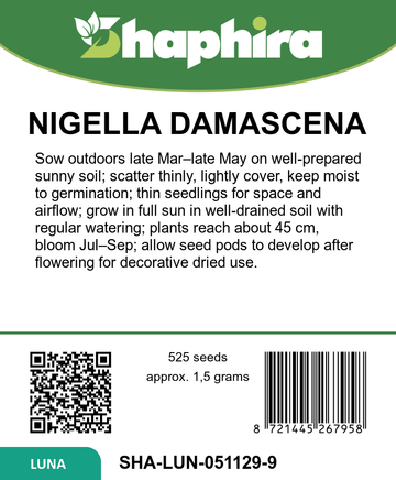 Sow Miss Jekyll Nigella Damascena seeds outdoors from late March to late May. Scatter seeds thinly in rows or broadcast them evenly on well-prepared, sunny soil. Lightly cover with a thin layer of soil to ensure good contact. Keep the soil moist until germination. Once seedlings appear, thin them to allow enough space for growth and airflow. This annual thrives in bright locations and will grow to about 45 cm tall, making it a lovely addition to garden borders or flower beds.