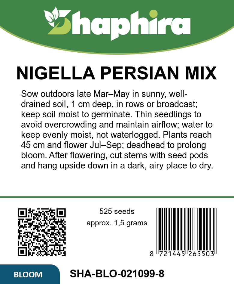 Sow Nigella Persian Jewels seeds outdoors from late March to May, either broadcast or in rows. Lightly thin seedlings to avoid overcrowding and ensure healthy growth. Choose a sunny spot with well-drained soil for best results. Sow seeds about 1 cm deep and keep the soil moist until germination. These charming plants reach up to 45 cm and create a lovely pastel display. After flowering, the decorative seed pods can be harvested with stems and hung upside down in a dark, airy place to dry, offering beautiful elements for floral arrangements.