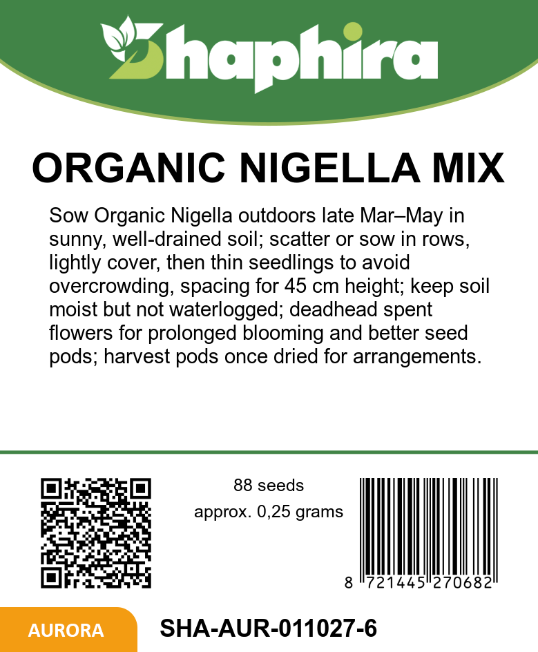 Sow Organic Nigella Damascena Persian Jewels Mix outdoors from late March to May, either scattered or in rows. Lightly cover the seeds with soil and thin out seedlings to avoid overcrowding, ensuring healthy growth. Choose a sunny spot to enhance flowering potential. These annual flowers grow to about 45 cm tall and are perfect for borders or cut flower arrangements. Their decorative seed pods are excellent for drying. Planting during the recommended months supports a vibrant bloom period from July through September, adding soft pastel hues to your garden landscape.