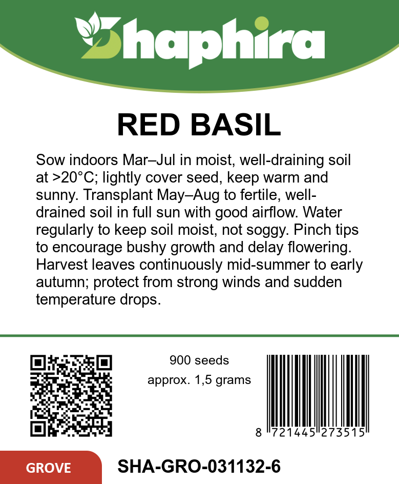 Red leaf basil from this variety grows to a manageable height of around 30 cm, making it suitable for both indoor and outdoor herb gardens. Whether you start sowing indoors from March through July or outdoors from May to August, the plant thrives in warm conditions, offering a harvesting period from July to September. These large leaf red basil seeds are an excellent choice for anyone looking to cultivate an aromatic basil variety that combines visual appeal with culinary benefits. Perfect for those seeking red basil seeds for pesto or other fresh herb applications, this basil plant cultivation option enhances any herb garden with its distinctive color and rich scent.