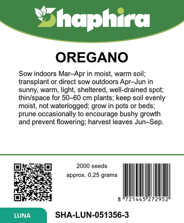 Sow oregano seeds indoors from March to April in a seed tray or directly outdoors between April and June. Choose a warm, sheltered spot with plenty of light for optimal growth. Keep the soil consistently moist but well-drained to encourage healthy development. Transplant seedlings carefully once they have established roots. Harvest leaves from June to September, ideally before the plants start flowering, to enjoy the best mild and spicy flavor. This perennial herb thrives in pots or garden beds, making it a versatile and rewarding addition to your culinary herb collection.