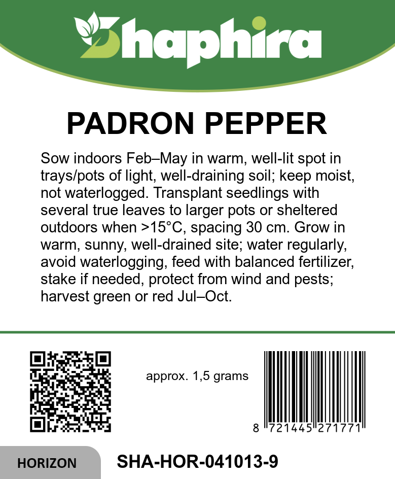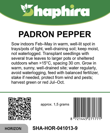 Bring a touch of Spain to your vegetable garden with these padron pepper seeds (Capsicum annuum). This mild green frying variety produces small, aromatic peppers that are ideal for tapas, pan-frying and snacking. The fruits start bright green and can mature to red if left longer on the plant, adding extra color to your harvest. Compact, productive plants make these mild green pepper seeds a great choice for kitchen gardens, raised beds and patio containers. Perfect as padron pepper seeds for planting in pots or garden borders, they offer a long picking window from midsummer into autumn.