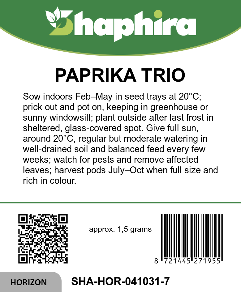 Sow paprika seeds indoors from February to May at around 20°C for optimal germination. Transplant seedlings into pots or a greenhouse once they develop sturdy leaves. These mid-early varieties thrive in bright, warm conditions, producing vibrant peppers from July through October. Regular watering and well-drained soil encourage healthy growth and rich flavor. Rotate crops annually to maintain soil fertility and reduce pests. Harvest peppers when fully colored for the sweetest taste, perfect for fresh salads or cooking. Enjoy the beautiful mix of colors and fresh flavors throughout your extended growing season.
