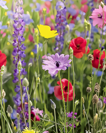 Perennial field flower mixture with vibrant blooms attracting bees and butterflies for biodiversity gardens.