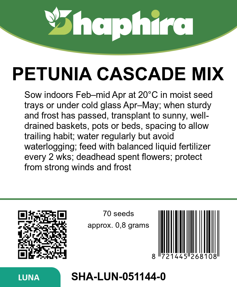 Sow Petunia Cascade F1 seeds indoors from February to mid-April at around 20Β°C for best germination. Transplant seedlings outdoors from early May once the risk of frost has passed. Choose a sunny location with well-drained soil to encourage vigorous growth and abundant blooms. These trailing petunias thrive in hanging baskets and large pots, spilling cascades of colorful flowers throughout summer to autumn. Regular deadheading helps promote continuous flowering, while moderate watering ensures healthy plants. Enjoy a vibrant display that brightens balconies and garden spaces effortlessly.