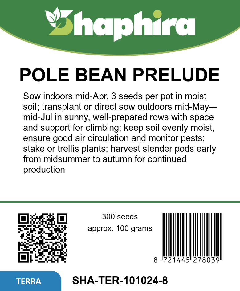 With about three seeds per gram, 100 grams of Prelude pole beans seeds is sufficient to sow a 30-meter row, making it efficient for both small and larger garden spaces.