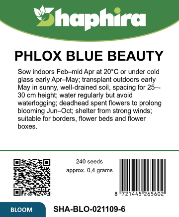 Sow Phlox Flame Flower Blue Beauty seeds indoors from February to mid-April at around 20Β°C in a seed tray or under cold glass from early April to May. Once seedlings are strong enough, transplant them outdoors in early May. When planting outside, space the plants to allow for their mature height of approximately 25 to 30 cm. Choose a sunny location with well-draining soil for the best results. This method ensures a vibrant display of violet-blue blossoms throughout the summer months, perfect for borders, flower beds, and flower boxes.